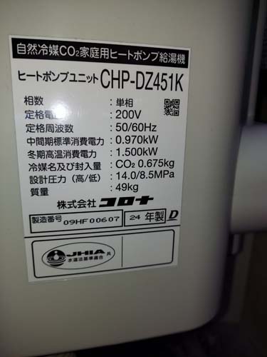 川越市 コロナ自然冷媒CO2家庭用ヒートポンプ給湯機 ヒートポンプユニットCHP-DZ451K エコキュート交換工事