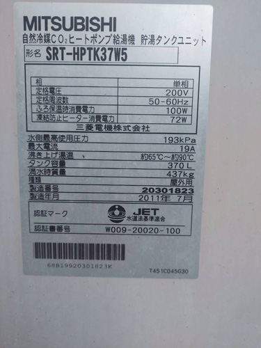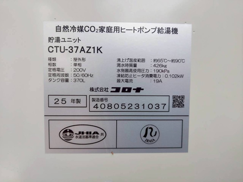 渋川市北橘町 三菱電機自然冷媒CO2ヒートポンプ給湯機 貯湯タンクユニットSRT-HPTK37W5→コロナ自然冷媒CO2家庭用ヒートポンプ給湯機ヒートポンプユニットCHP-DZ451K、貯湯ユニットCTU-37AZ1K エコキュート交換工事