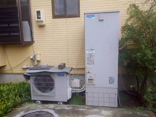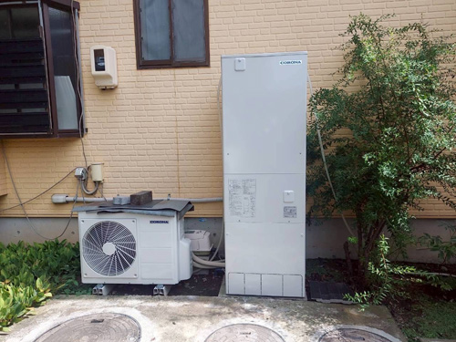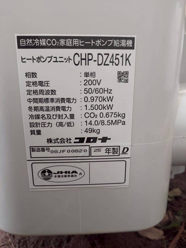 渋川市北橘町 コロナ自然冷媒CO2家庭用ヒートポンプ給湯機ヒートポンプユニットCHP-DZ451K、貯湯ユニットCTU-37AZ1K エコキュート交換工事